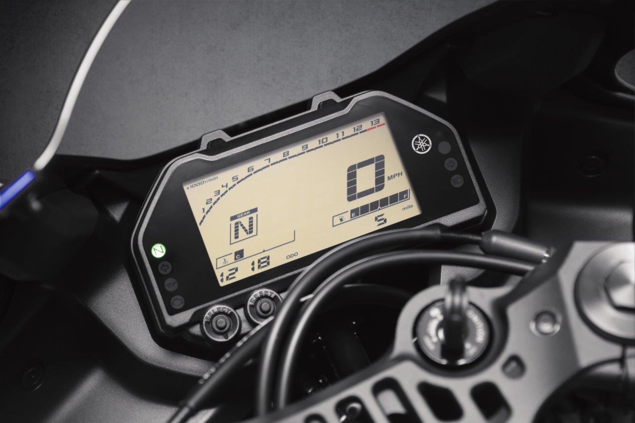 The compact multi-function meter informs the rider of gear position, fuel capacity, real-time and average fuel economy, water temp, clock and an oil change trip meter—all presented in a clean, modern layout.