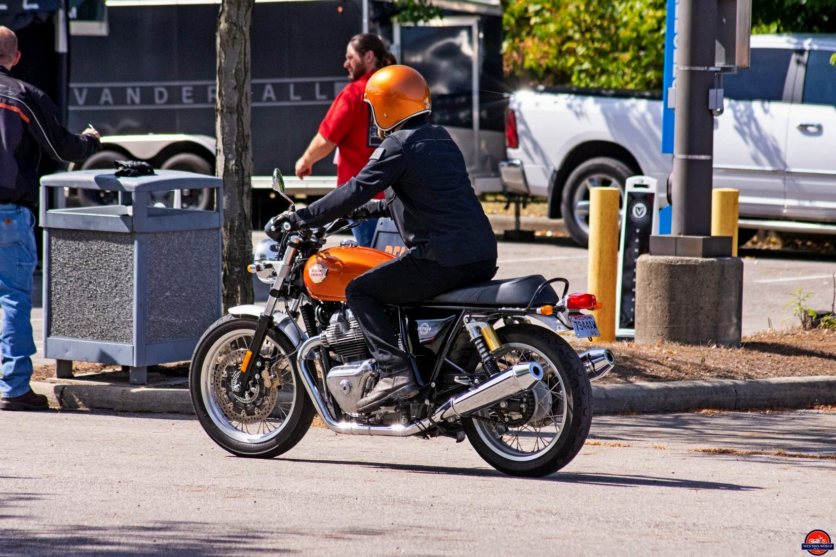 Not only did they have a loaner helmet for him, but it was a color matching helmet for the bronze-orange colored INT650 bikes we were offered by the RE (Royal Enfield) reps.