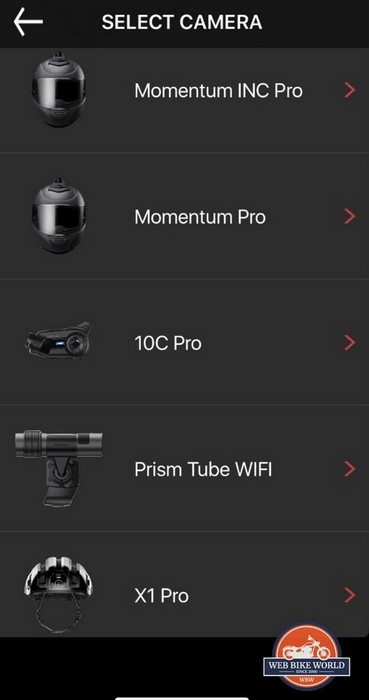 As you can see in the screenshot above the SENA Camera app works for any SENA device with an integrated camera. On the 10C Pro, you have to go into your WiFi settings and connect to the 10C Pro instead of using Bluetooth.