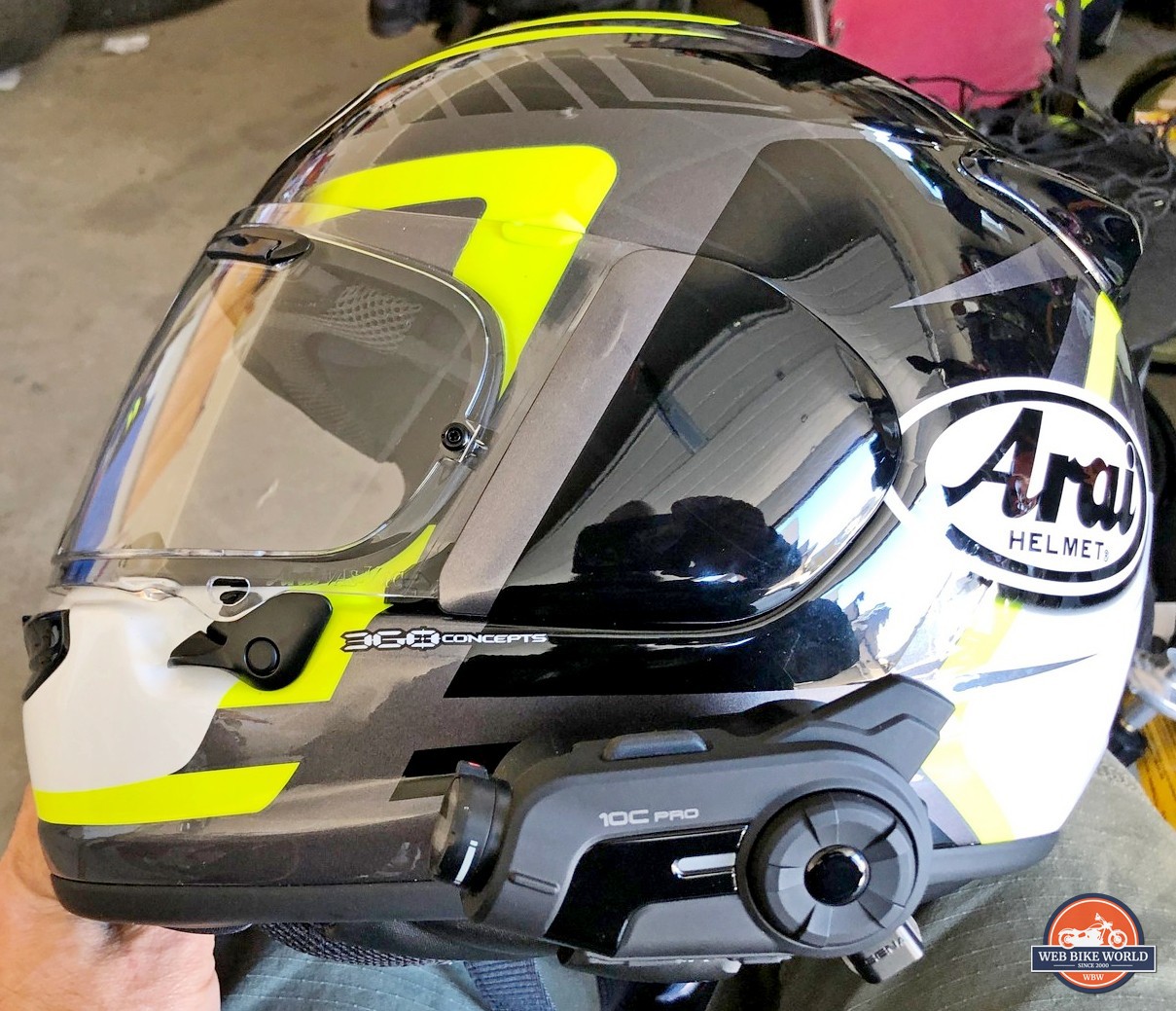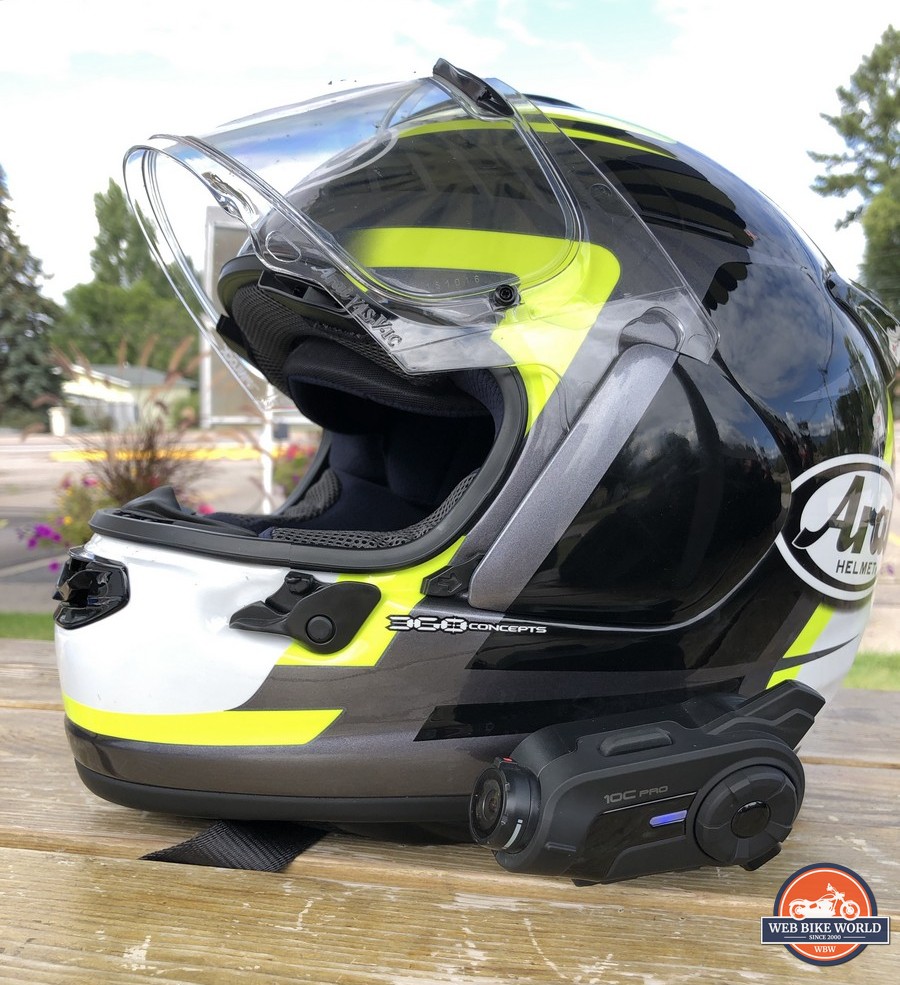 The SENA 10C Pro installed on an Arai DT-X helmet (below).