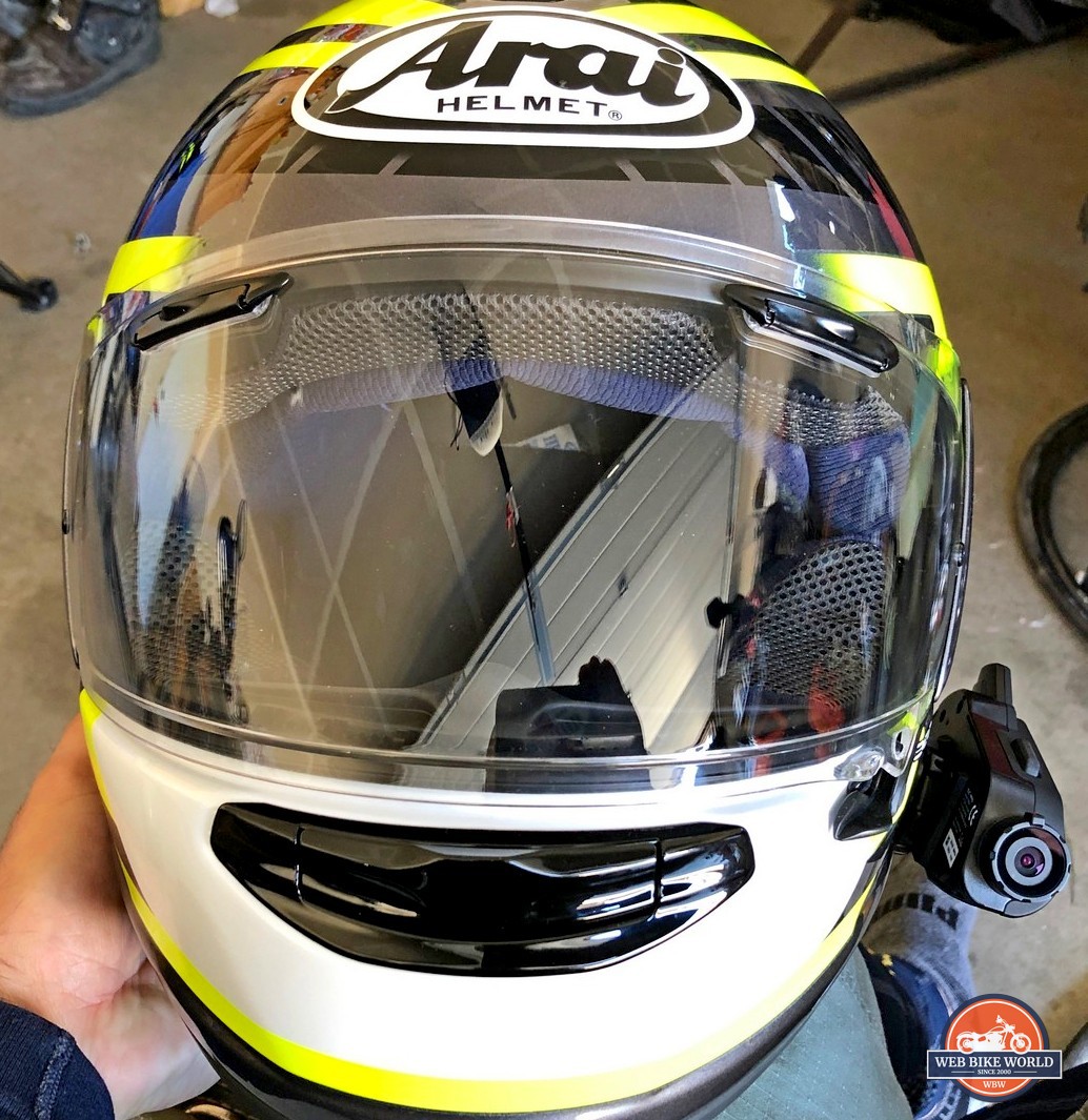 I found it easy to accomplish in either helmet using the clamp style mount. I did have to carve out a small section of the cheek pad plastic in the Arai in order to pass the wiring through from the camera to the headphones and microphone installed inside the helmet.
