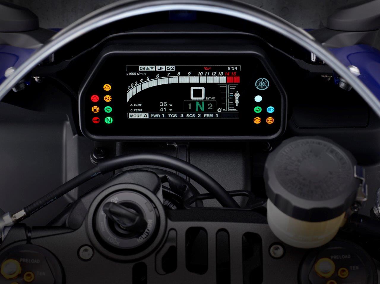 The R1 features a brilliant full-color, thin-film transistor (TFT) meter, with front brake pressure and fore/aft G-force readouts, giving the rider even more feedback from the machine. It features both street mode and a track mode that focuses on performance information, such as YRC settings (including EBM and BC systems), a zoomed-in view of the tachometer in the upper rpm range, a lap timer, gear position indicator, and speed.