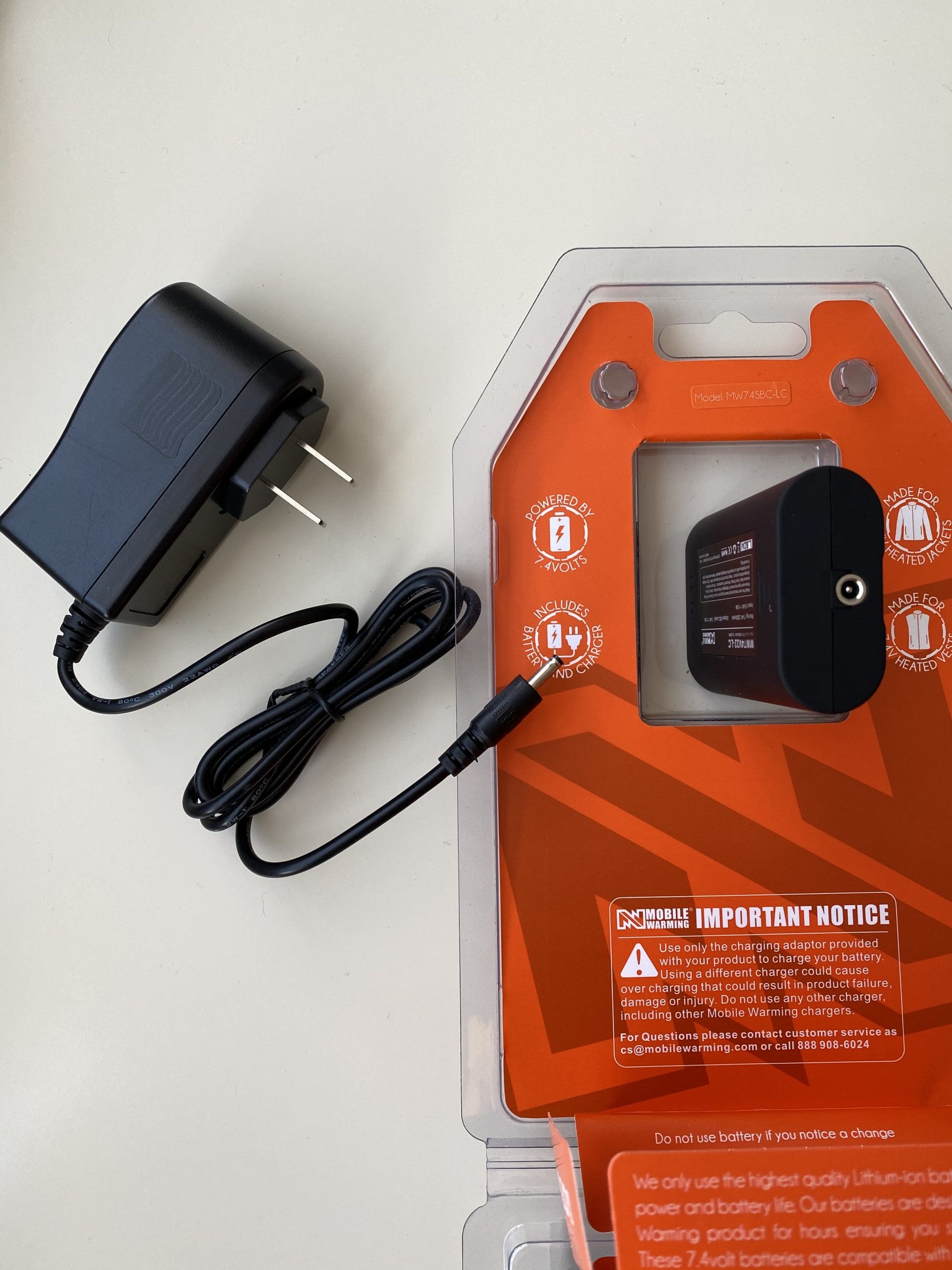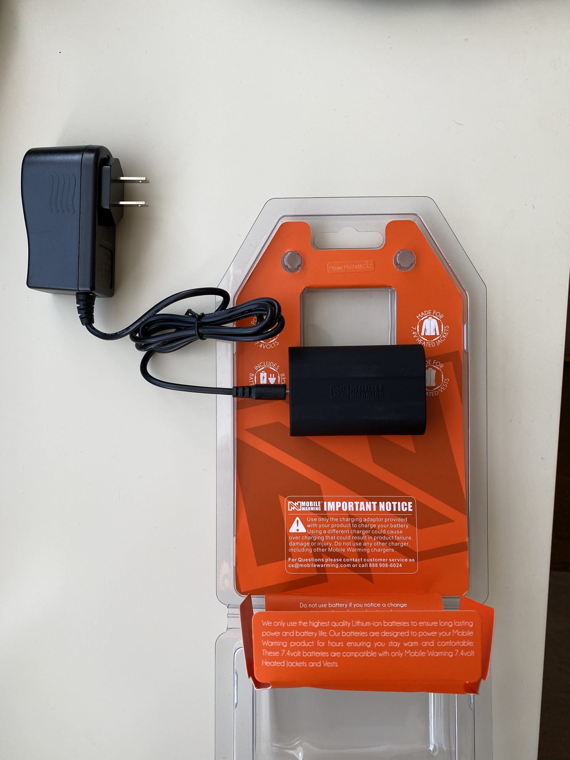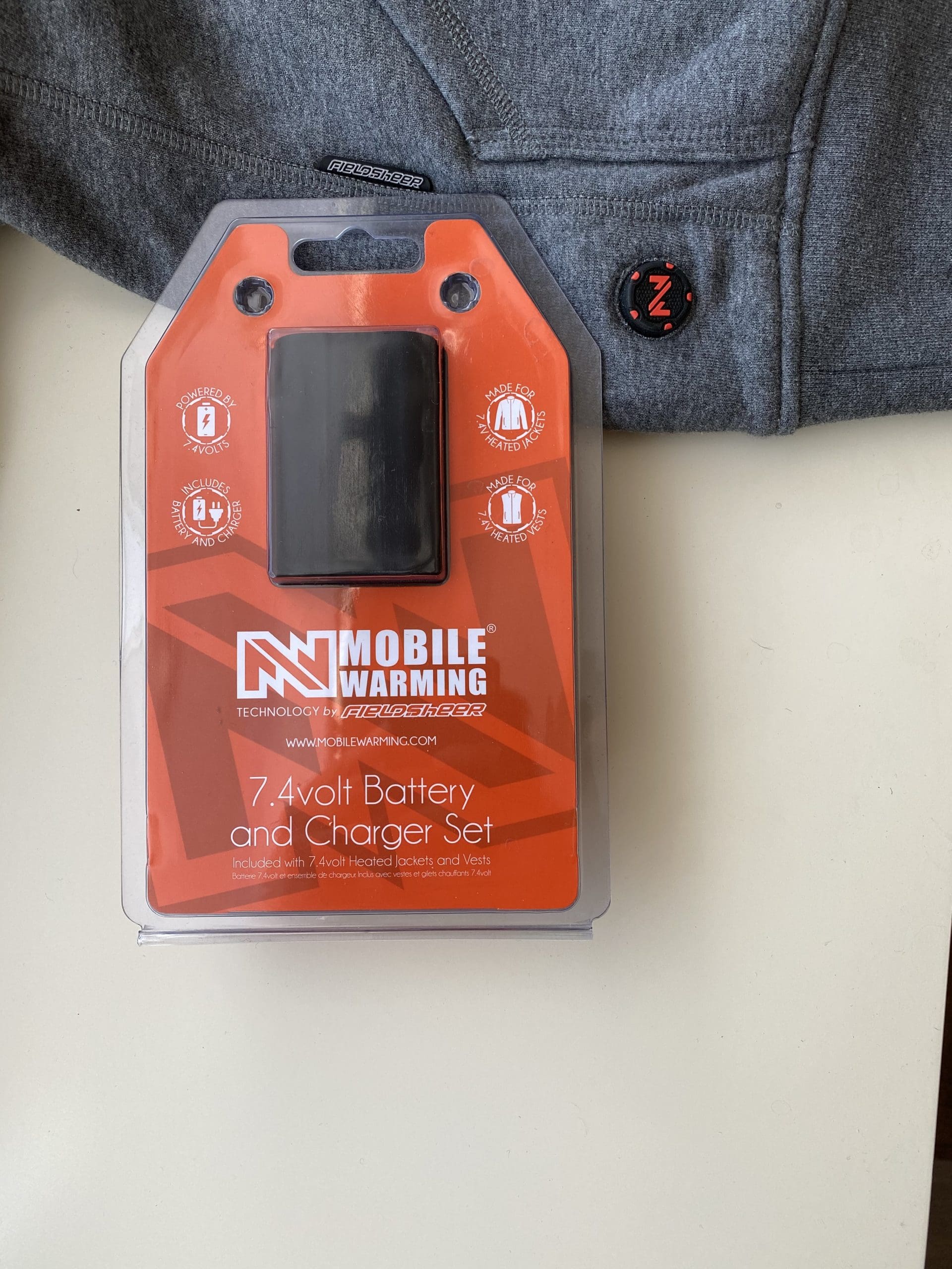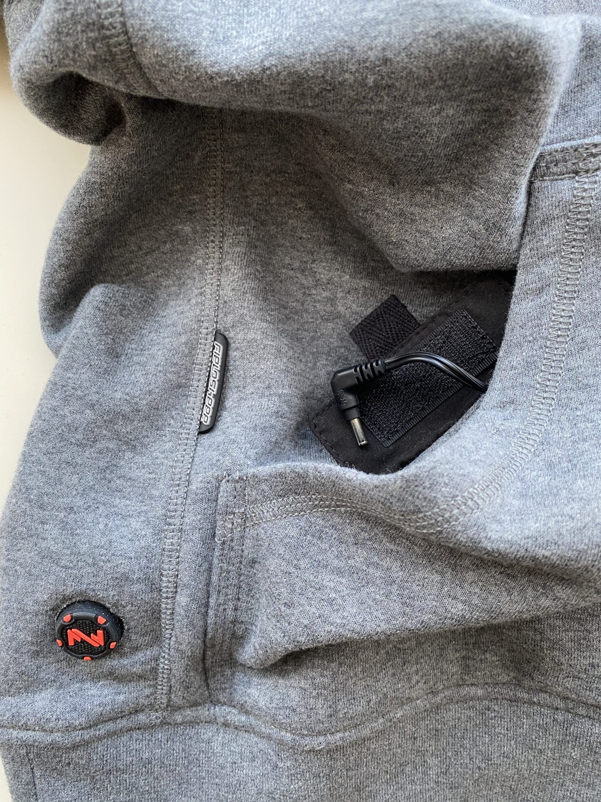 The hoodie and battery come in separate packaging. After charging the battery with the included charging cable, it is as easy as plugging in the battery, stowing it in the velcro pouch, and hitting the power button. Within a few short moments, you’re in heated hoodie heaven.