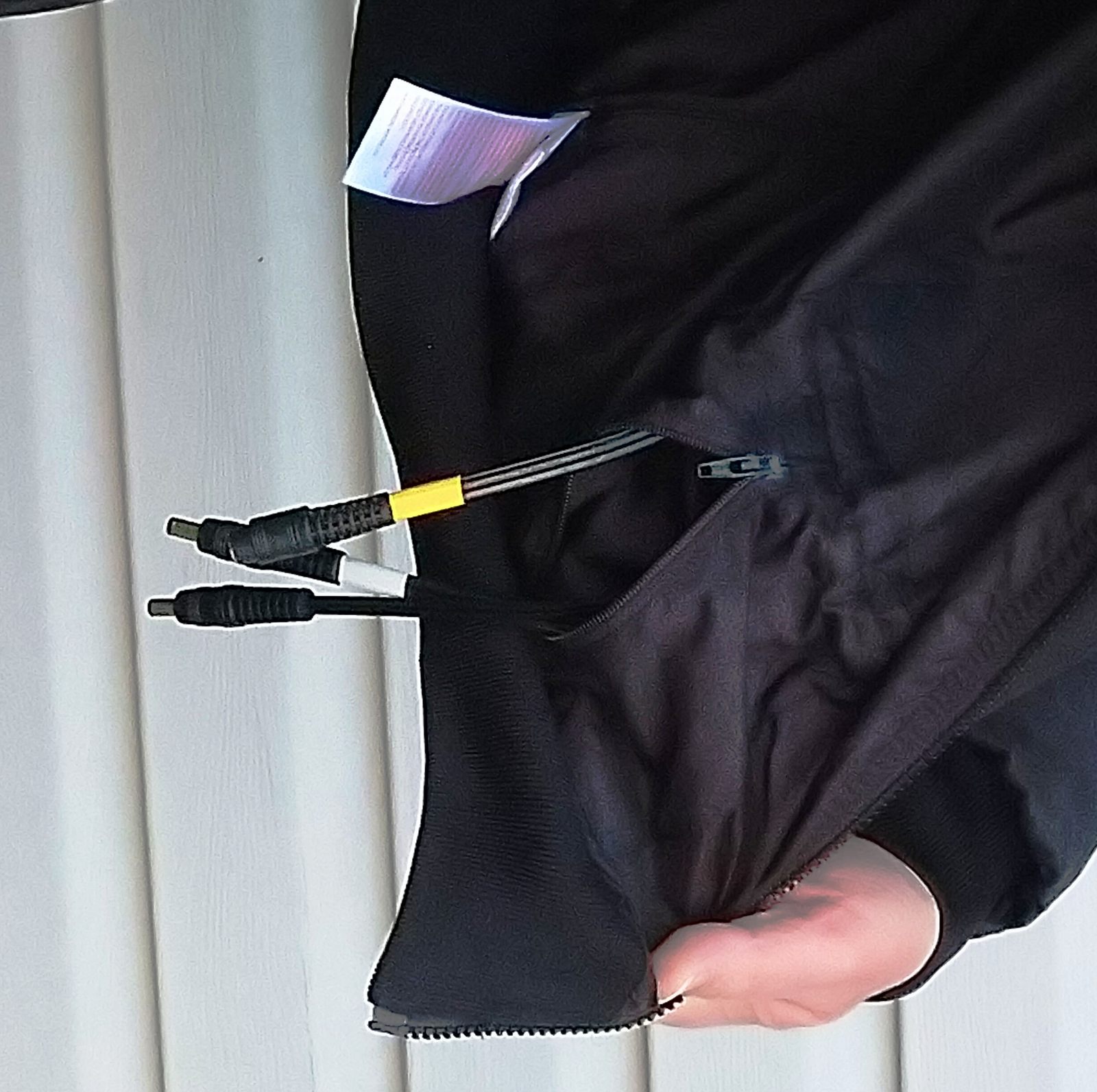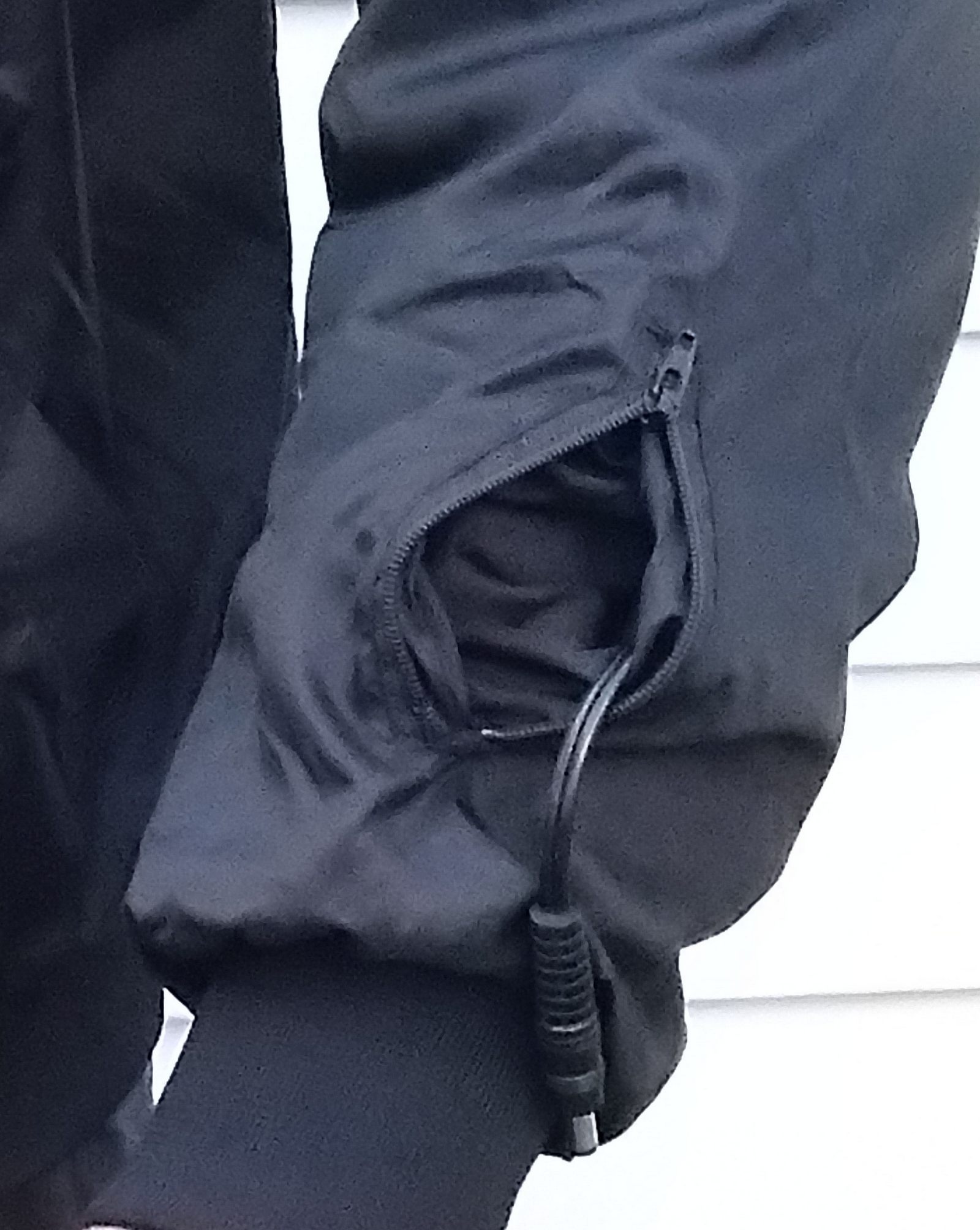 The small zippered pocket on the lower-left inner liner houses the three connection leads cleanly (no bulging or sharp edges) while the zippered pockets on the sleeves for the glove interconnect leads are visually seen but not felt.