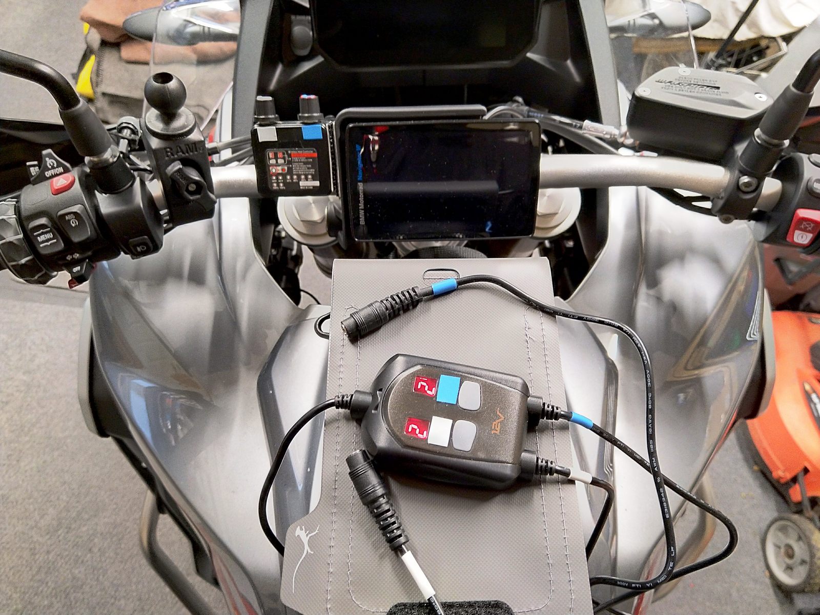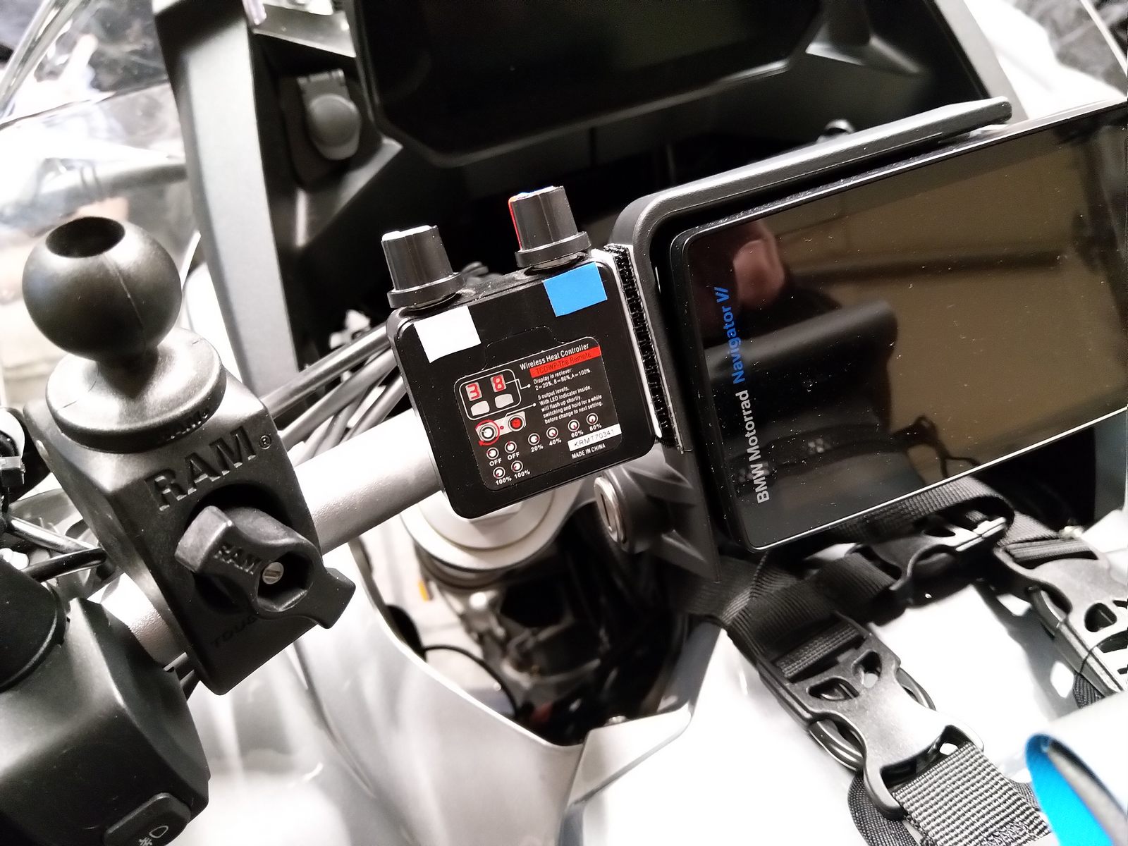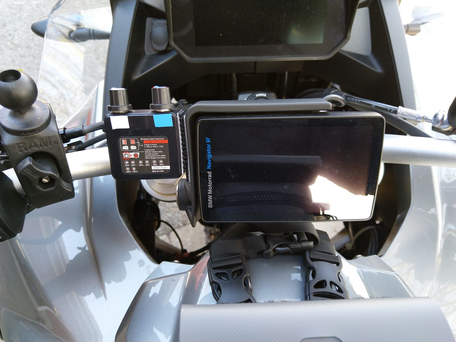 From here it is an easy matter to connect the Dual Therm Controller that is positioned on the left side of the handlebar usually with a 3M Dual-Lock piece that may or may not be adhered to a RAM-B mount or more recently, to the left side of the BMW Navigation Cradle housing.