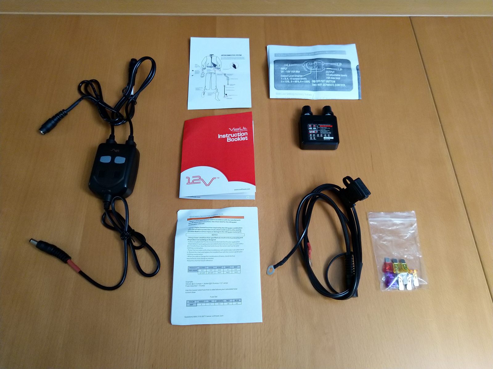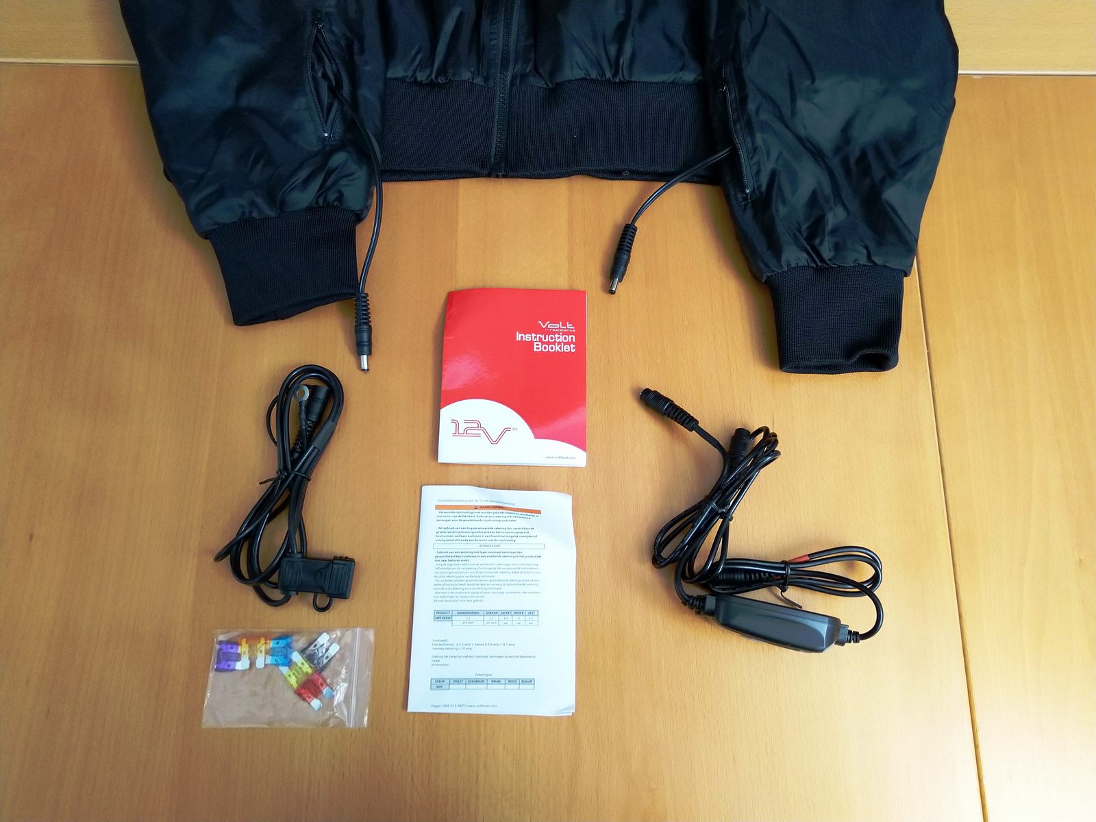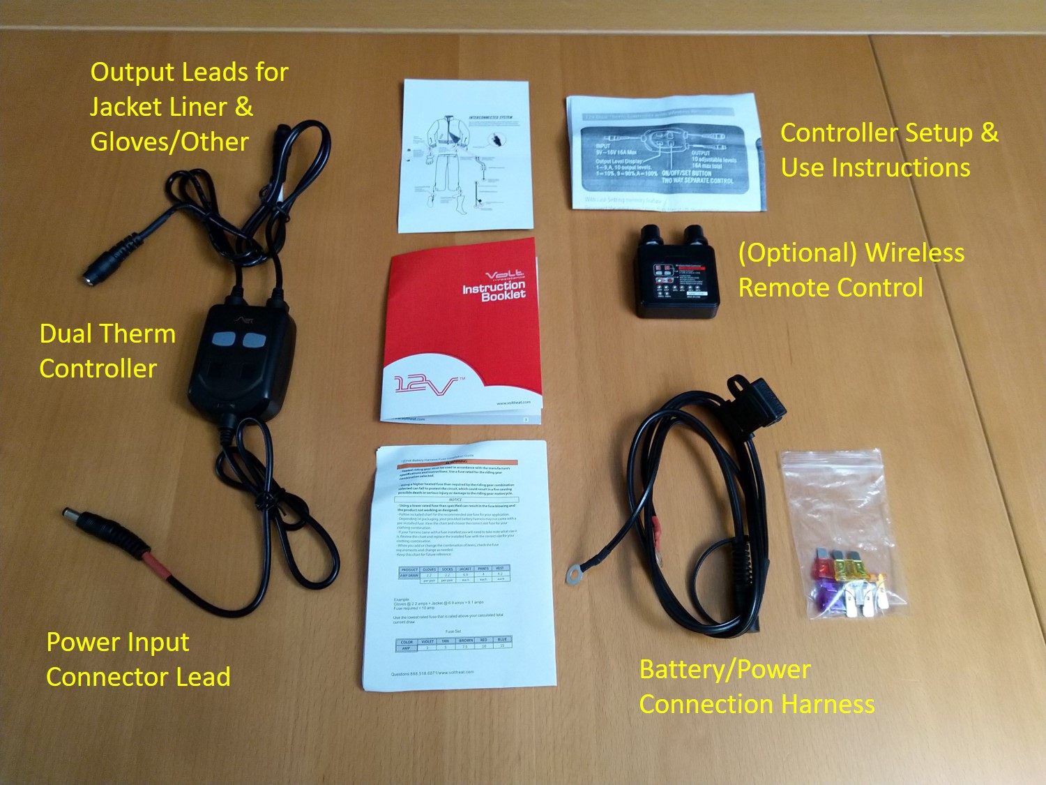 Along with the folded Heated Jacket Liner, Black, Size XL, is a bag containing the 12V (Battery) Connection Harness with inline fuse module and direct connection ring terminals, a small bag of ATC fuses, the Dual Therm Controller and small pocket sized handouts detailing how to connect, interconnect and determine amperage draw for proper fusing and safe operation.