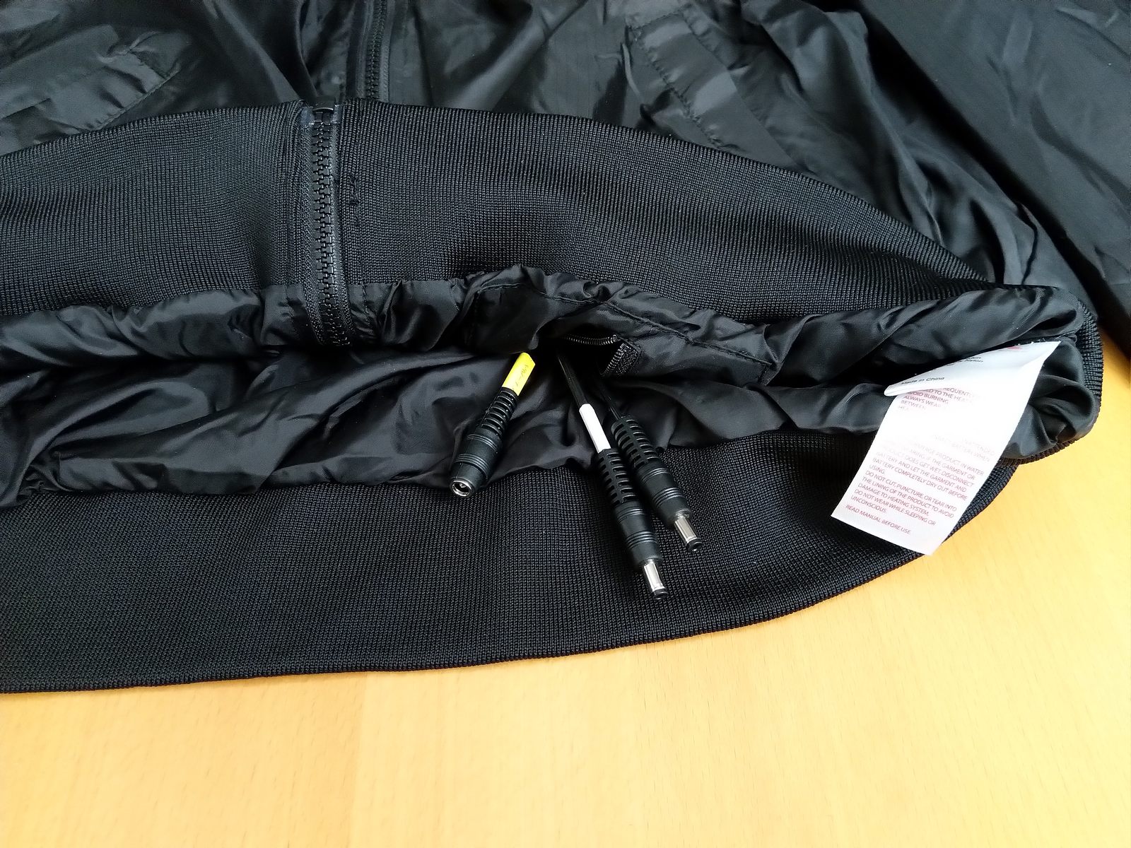 Weight & Feel – considering connectors and harnesses, the jacket liner with its multiple heating panels makes for a light comfortable garment. The three leads and connectors located in the lower-left front can be felt a bit when sitting, but they are not intrusive and do not become uncomfortable. The glove connection leads in their sleeve pockets can go unnoticed.